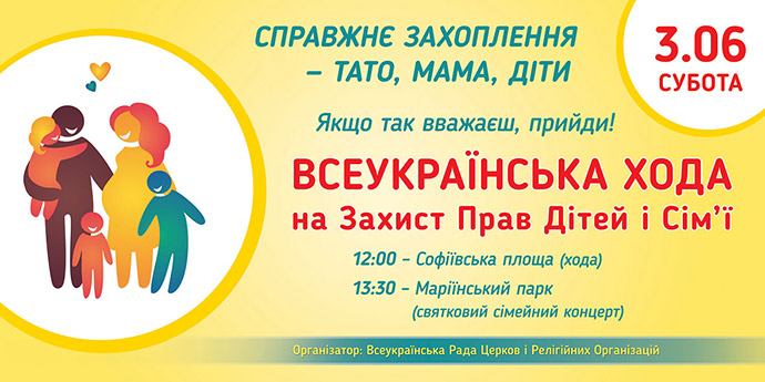 У суботу, 3 червня 2017 року, в Києві відбудеться щорічна Всеукраїнська Хода на захист прав дітей і сім’ї під гаслом: «Справжнє захоплення – це тато, мама, діти!»